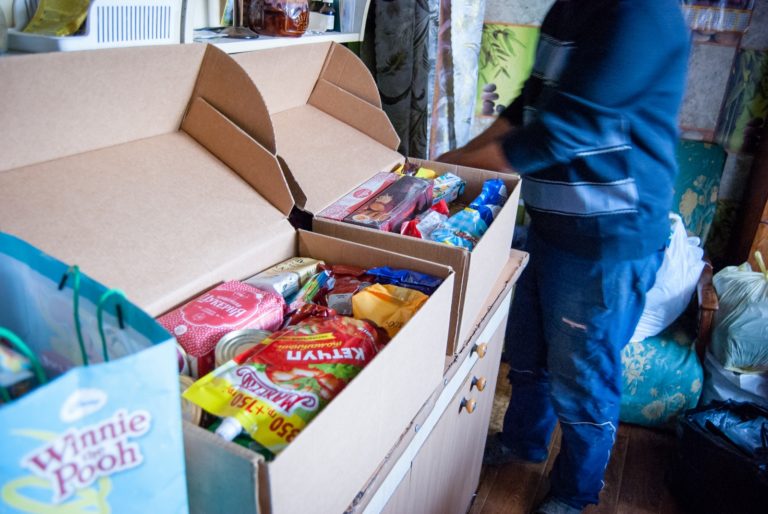 Мы заносим вещи в дом и начинаем распаковывать помощь для семьи из Борисова. Еду кладем на стол, что-то сразу отправляется на пустые полки, одежду пока складываем в угол.