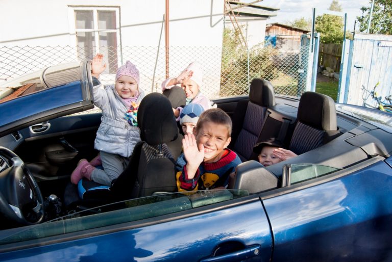 Вот уже день подходит к концу. Семья выходит на улицу, чтобы еще немного с нами пообщаться и проводить. Дети с интересом обступают кабриолет, на котором мы привезли вещи. И конечно же хочется им и в этом угодить. Снимаем крышу, рассаживаем ребятишек - своих и соседских, и не спеша катимся по улице. Вот оно - короткое и радостное детство!